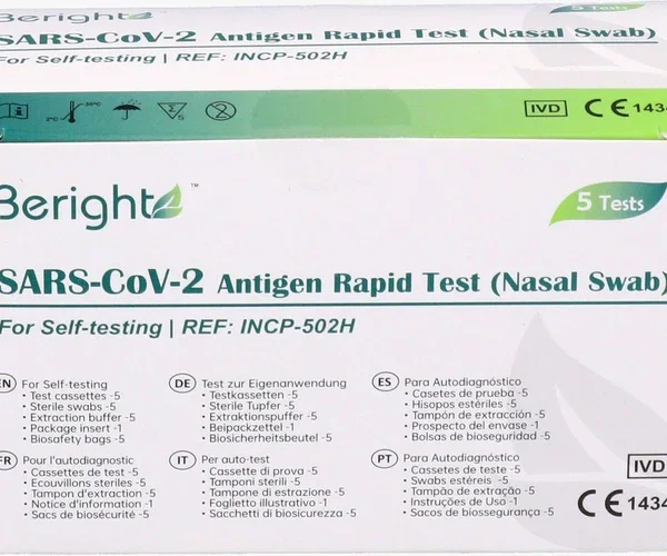 „BERIGHT“ Corona Antigen Schnelltest zur Eigenanwendung für Laien / VPE 5er / CE-Zertifizierung / BfArM-Listung (AT1172/21) / PEI Evaluiert Geprüft