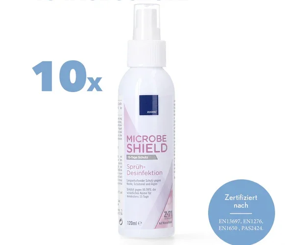 Zoono Z-71 Micobe Shield 10x Flächendesinfektionsmittel 120 ml Schutz für mind. 15 Tage auf Oberflächen gegen 99,99 % aller Keime ( Zertifiziert nach PAS 2424 / EN13697 / EN1276 / EN1650 ) Gratis Versand